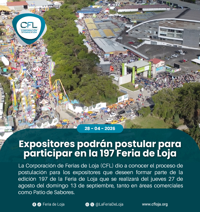 La Corporación de Ferias de Loja (CFL) dio a conocer el proceso de postulación para los expositores que deseen formar parte de la edición 197 de la Feria de Loja que se realizará del jueves 27 de agosto del domingo 13 de septiembre, tanto en áreas comerciales como Patio de Sabores.